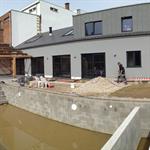 cuisine contemporaine, ergonomique, toute équipée, plan de travail effet pierre, évier inox, douchette manuelle, plafonniers incrustés, rangements blanc mat, hotte intégrée