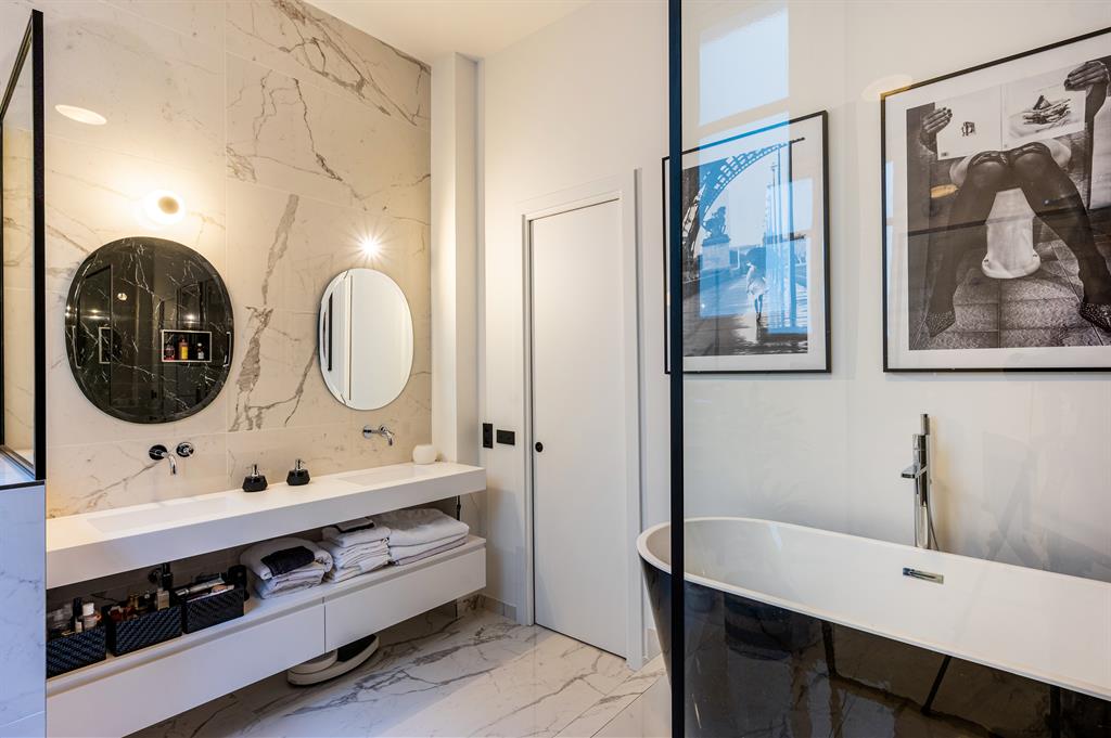 Aménagement d'une grande salle de bain en marbre noir et blanc