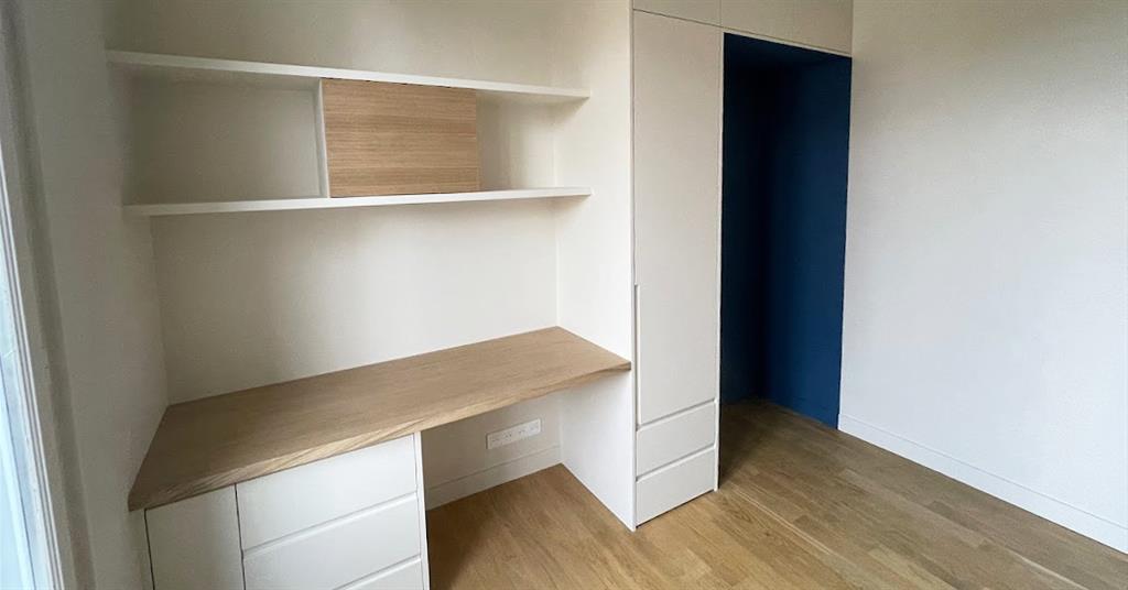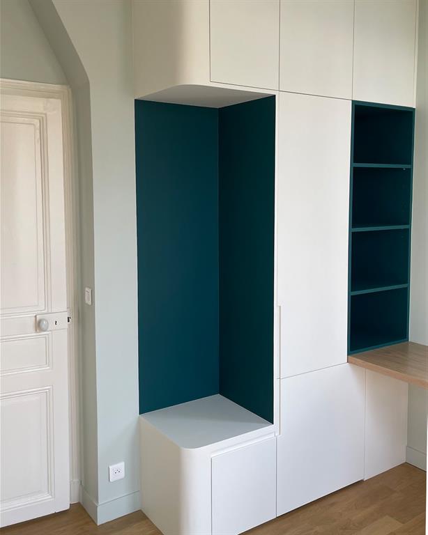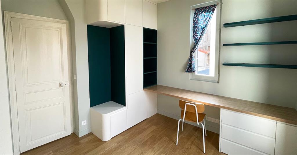 Des chambres à meubler sur mesure : A partir des teintes existantes de ces chambres, conception de mobilier 100% sur mesure pour des adolescentes. Pour cette première chambre, 2 modules de rangement toute hauteur dont un avec une niche décorative en partie haute. Second meuble en 3 parties : banquettes, rangements fermés et bibliothèque. Un grand bureau face à la petite fenêtre. Les angles de la banquette et des étagères sont arrondis. Pour la seconde chambre, l’idée était de fondre le mobilier dans la pièce avec la même teinte. Les alcôves sont soulignées par un bleu nuit. Le rangement est accompagné d’une banquette à sa droite. Le bureau est aussi dans les mêmes couleurs et accueille 2 étagères et un petit bloc en bois au milieu. Une armoire fait la séparation avec l’espace dédié au couchage. Une niche boisée côté lit sert de chevet.