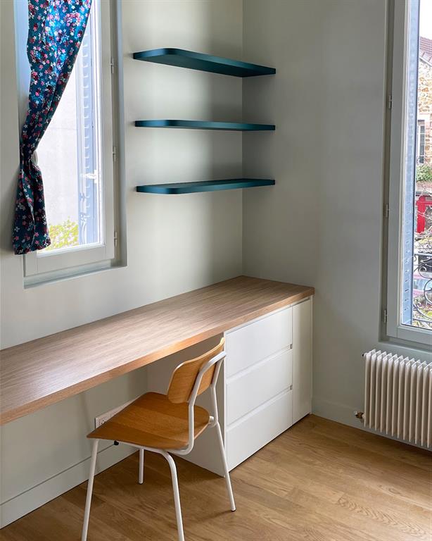 Catégorie / Style :Mots clés:étagères, bureau en chêne, plan de travail bois, bureau sur mesure, chambre enfant, chambre adolescent, rangement chambre, alcôve, architecte d'intérieur paris, décoratrice d'intérieur asnières, dose decoProduits sur la photo:farrow and ball, ressources -