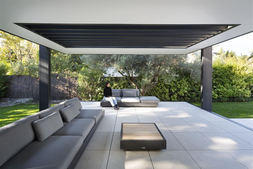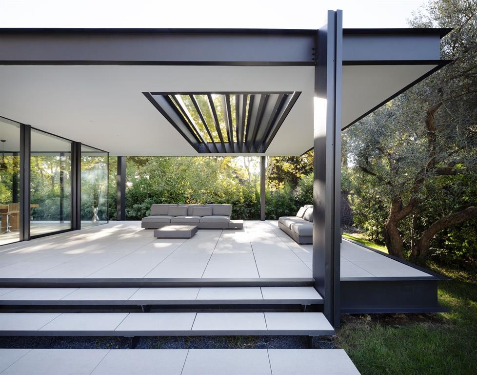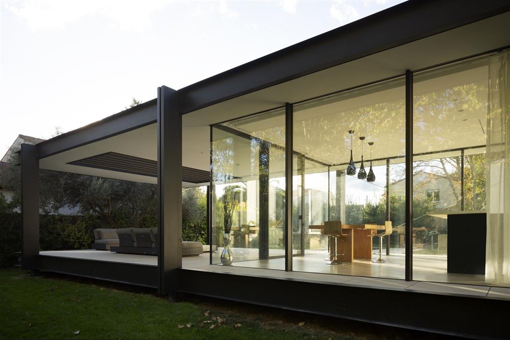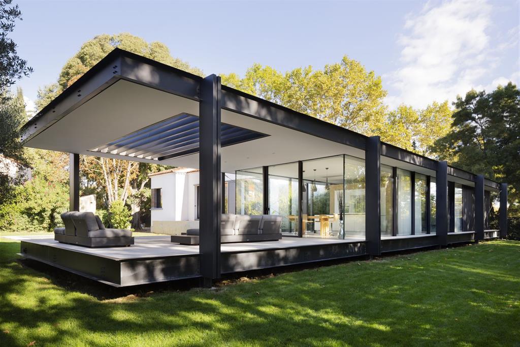 En référence à la Farnsworth de Mies Van Der Rohe, la typologie de la construction se traduit par une ossature métallique noire rationnelle et affirmée, permettant une totale transparence et alternant volumes de verres et terrasses lounge.