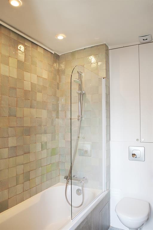 Petite salle d'eau optimisée avec toilettes. 1,57cm de large sur 2,2m de long. La douche s'inscrit entre deux colonnes technique et le mur des toilettes. les rangements sont intégrés au bâti avec un petit lavabo peu profond dans l'alignement.