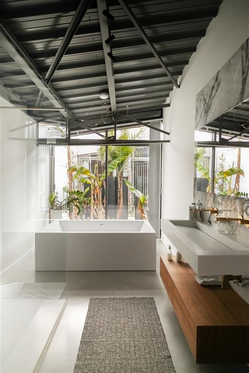 Catégorie:Style:Credits Photo:Simon BouissonProduits sur la photo:Produits: Parois / Plaques en béton DUCTAL® Plan vasque / Beton Lege® Couleur/finition: Parois / 512 – Minéral Lisse plan de vasque / 500 – Minéral Lisse -