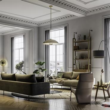 Si le salon classique incarne le luxe et le raffinement, c’est qu’il s’inscrit souvent dans un intérieur d’époque avec parquet de chêne, soubassements menuisés, moulures, et cheminée ancienne.